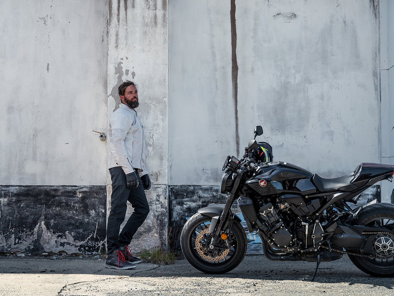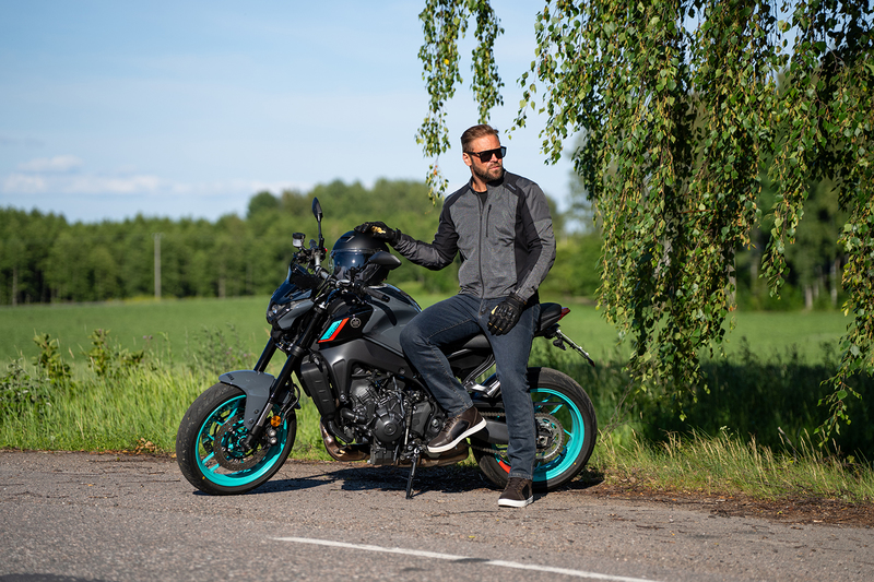 Adjustable level 2, CE certified protectors at shoulders and elbows / Can be supplemented with back and chest protection / Airbag Ready prepared with expanding panels / Long connection zipper to trousers